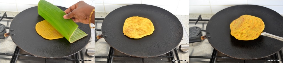 6. Heat the tawa and drizzle some ghee. Transfer the spread poli carefully on to the tawa.  Apply some ghee on top of it and flip to cook the other side too. Cook it on very low flame and when it turns golden brown remove from tawa.