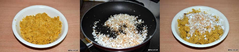 2. Meanwhile dry roast the grated coconut until it turns golden brown. Add it to the channel dal, jaggery mixture