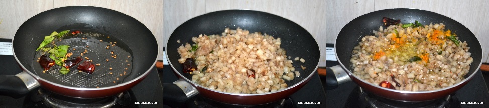 3. In a pan, add some oil and allow the mustard seeds and curry leaves to crackle. Then add the urad dal and torn pieces of dry red chilli. Once the urad dal turns golden brown, drain the chopped stem pieces completely from the buttermilk and add it to the Kadai. Sprinkle the required turmeric powder and salt, allow it to cook until it is soft(tender). Sprinkle water in between to avoid it from sticking to the bottom.