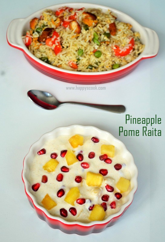I grow up eating a lot of cucumber pachadi and beetroot pachadi since mum makes it very often. So Pachadi/kichadi and raita made with yoghurt base are my real weakness. Recently, I saw some super fresh pineapple and I wanted to try some recipes with that. As I have already made pineapple pachadi quite a few times, I tried this simple Pineapple pome raita and it goes well with any pulao or raita. I have already shared the following raita recipes in the blog: